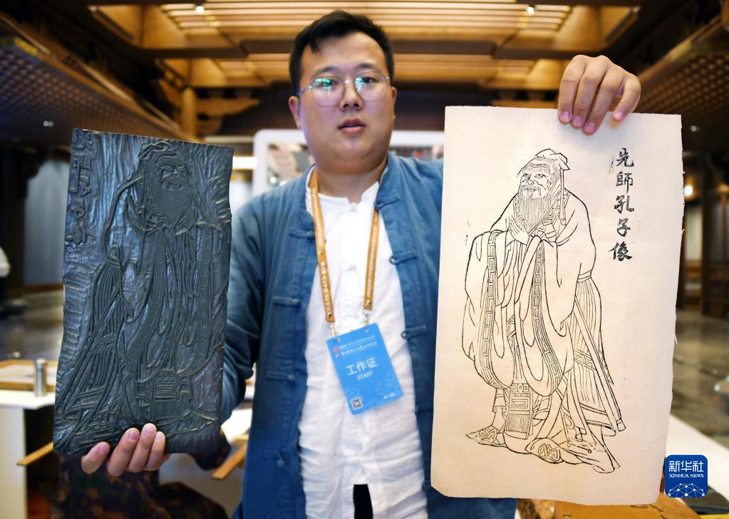 9月26日,木版年畫非遺傳承人潘成龍展示他創(chuàng)作的木版年畫孔子像。