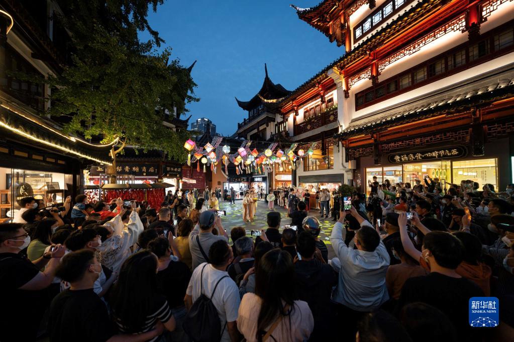 人們在上海豫園商城中心廣場觀看國風(fēng)主題表演(9月23日攝)。