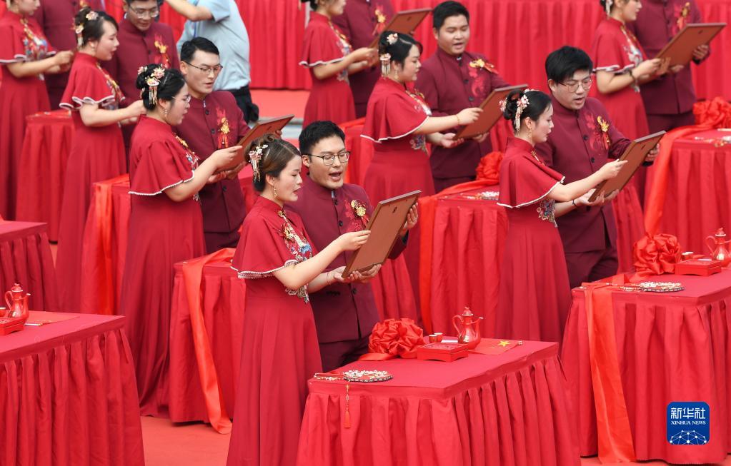 9月27日,新人們在集體婚禮儀式現場。