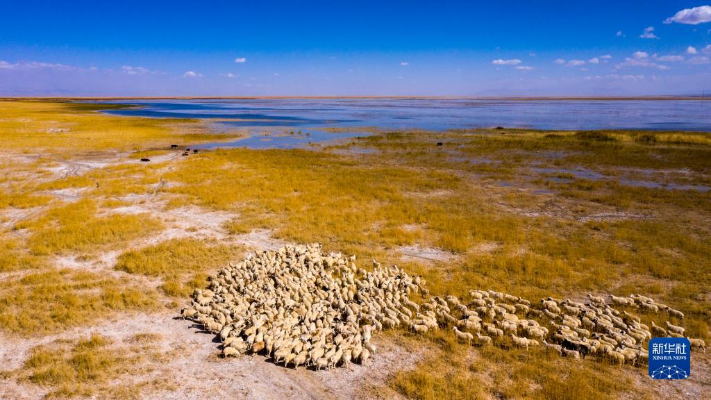 9月27日,牛羊在大蘇干湖畔覓食(無人機照片)。