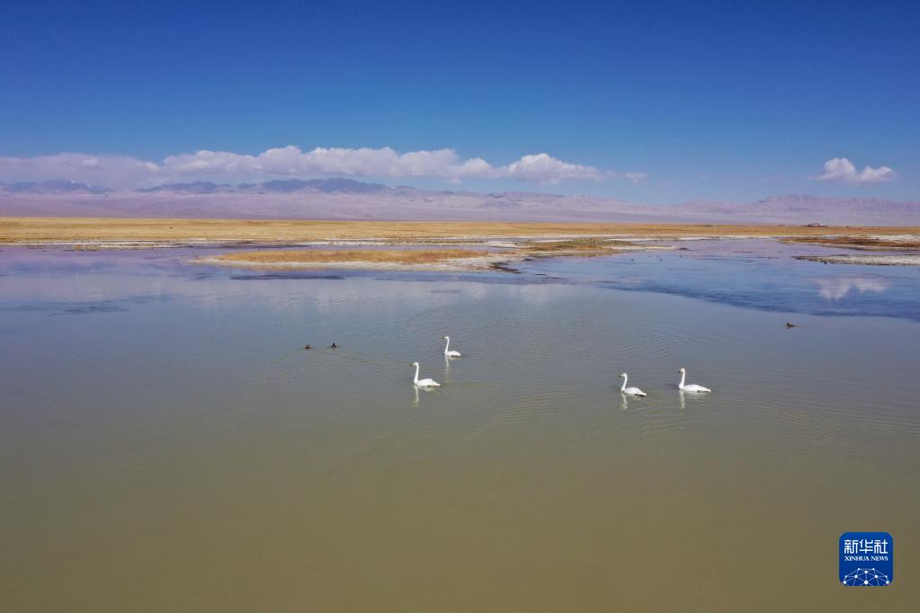 9月27日,天鵝和水鳥在小蘇干湖上游動覓食(無人機照片)。