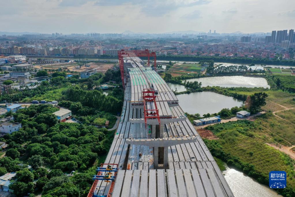 這是9月27日拍攝的莞番高速雙層橋架梁施工現場(無人機照片)。