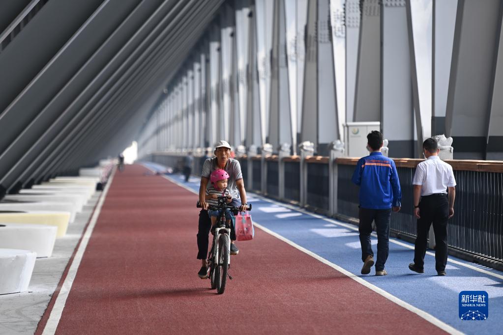 9月28日,市民在新彭埠大橋的慢行系統上騎行、步行。大橋的軌道層兩側設置了慢行系統,行人、非機動車可由此通過錢塘江。