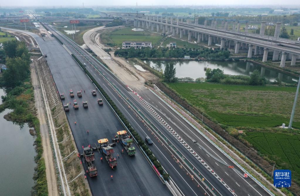 9月28日,京滬高速公路淮安段正在擴建施工中(無人機照片)。