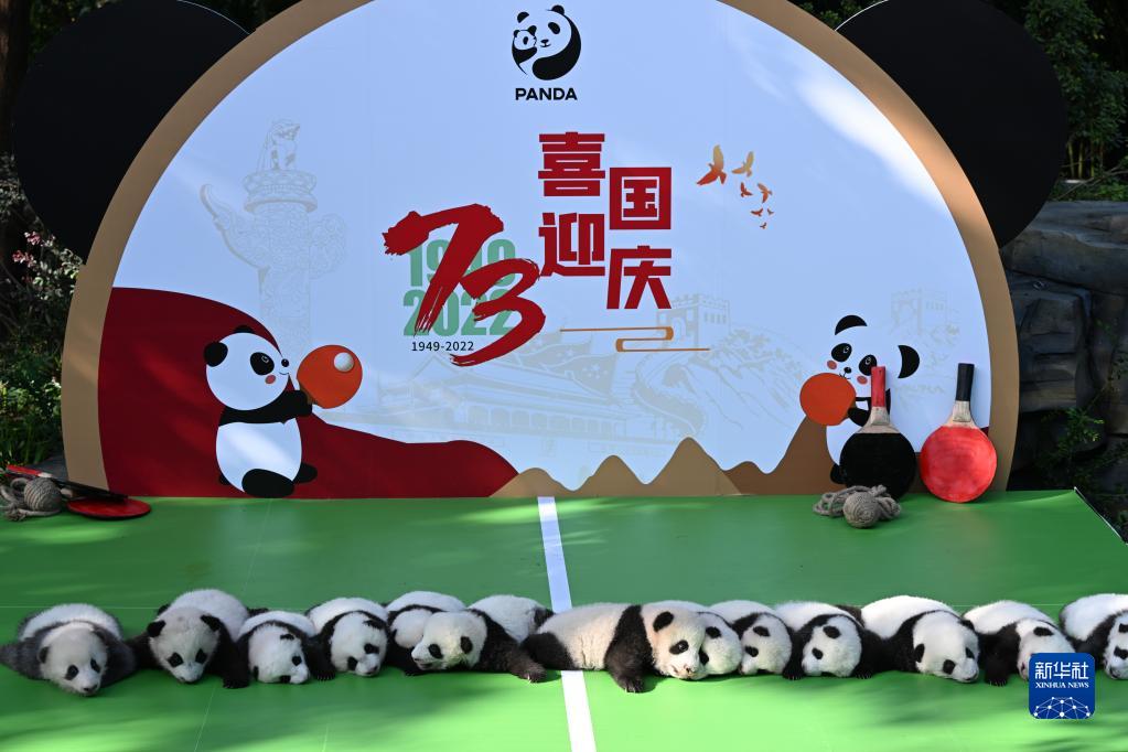 當日,為迎接即將到來的國慶佳節,成都大熊貓繁育研究基地內十余只2022級新生大熊貓寶寶一起亮相太陽產房。
