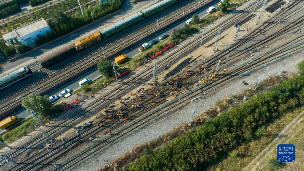 9月28日,中國鐵路太原局集團有限公司大同工務段工人在大秦線湖東站進行施工作業(無人機照片)。