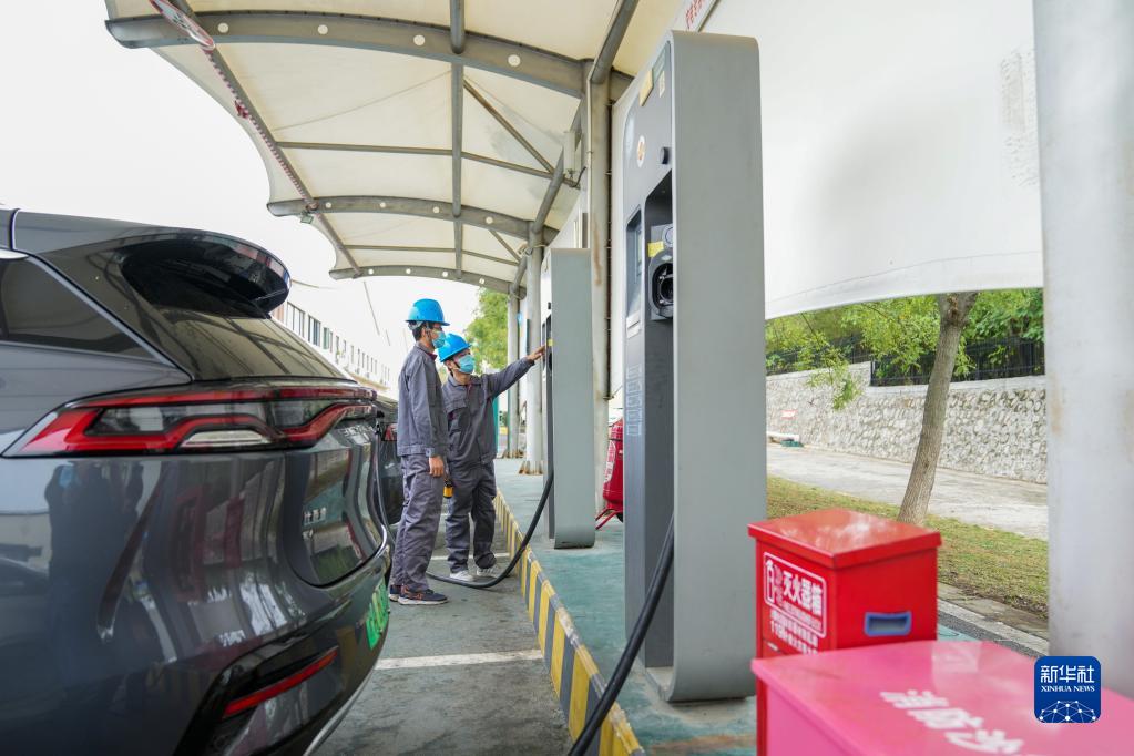 9月28日,工人在滬寧高速黃栗墅服務區檢查充電設施運行情況。