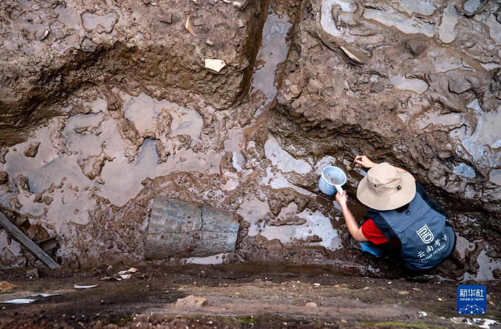 考古工作者在云南河泊所遺址現(xiàn)場(chǎng)進(jìn)行清理發(fā)掘工作(2022年9月21日攝)。