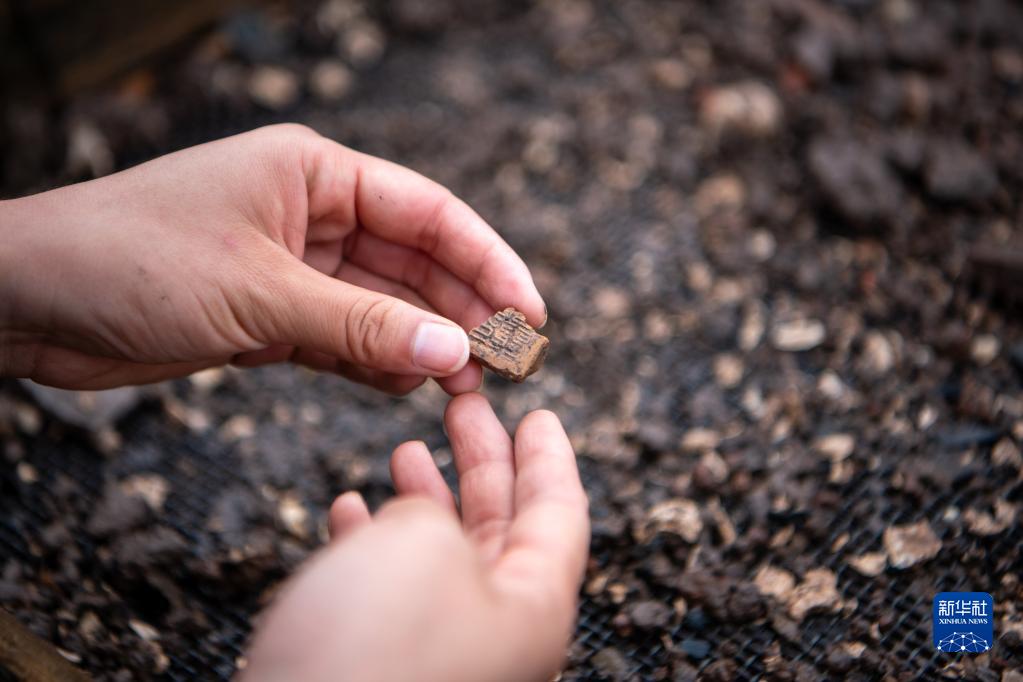 考古工作者在云南河泊所遺址現(xiàn)場檢查出土的封泥(2022年9月21日攝)。