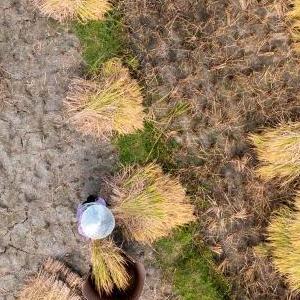 9月28日,福建省漳州市南靖縣書洋鎮曲江村村民在田間打稻谷(無人機照片)。