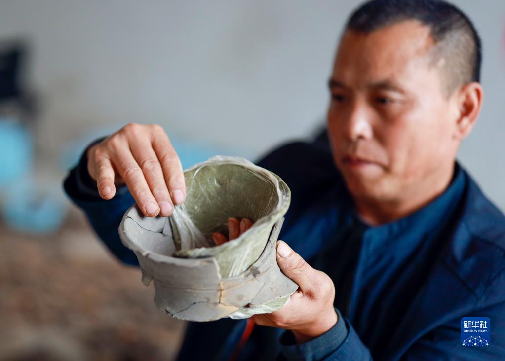 9月27日,考古發掘隊隊員秦彬在臨時庫房內,對一個剛完成拼對的陶器進行初步修復。