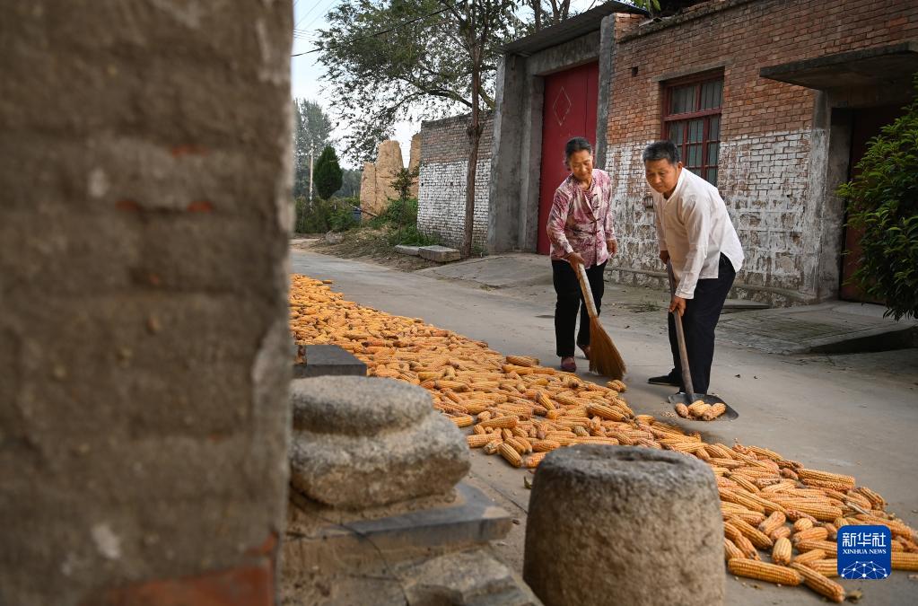 西北綜勘黃河老腔藝術團的主唱薛銀照(右)和妻子在家門口晾曬玉米(9月26日攝)。劇團的全體成員都是當地農民,主業為種糧。
