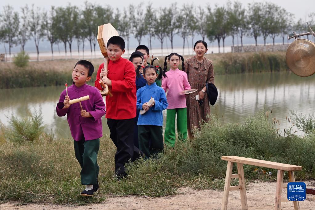 潼關縣秦東鎮濱河小學老師(右一)輔導學生練習“黃河老腔”(9月27日攝)。