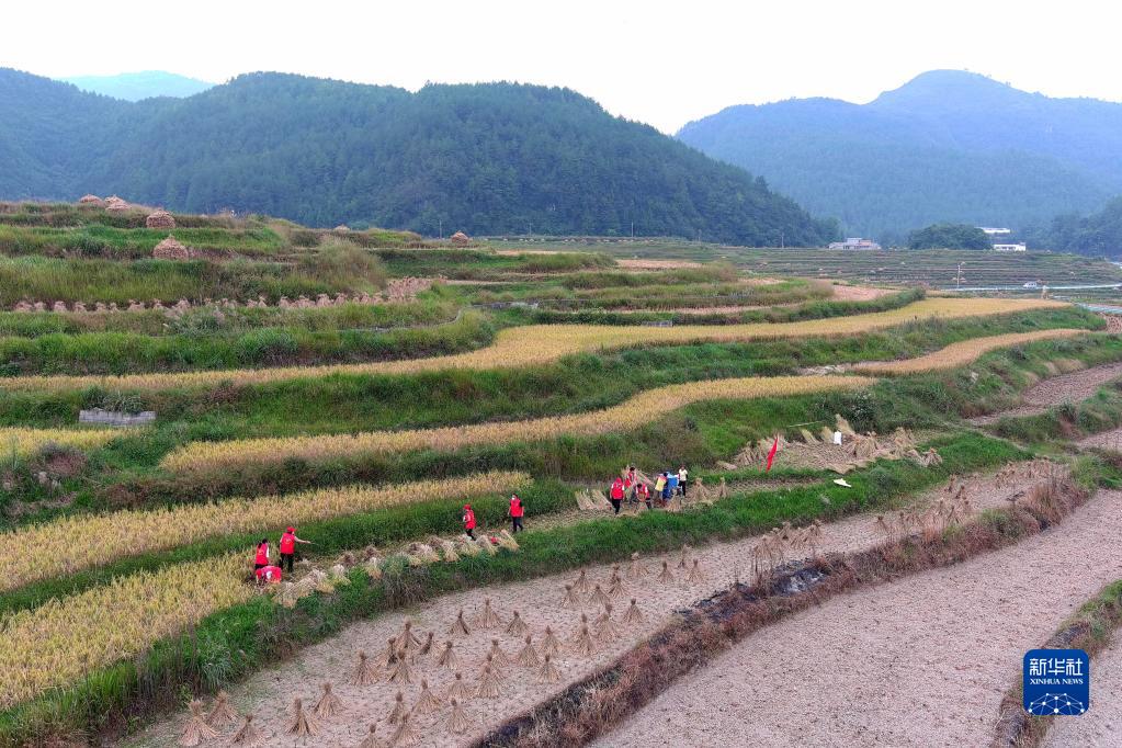 9月29日,貴州省龍里縣灣灘河鎮黨員志愿者在稻田里幫助農戶收割水稻(無人機照片)。