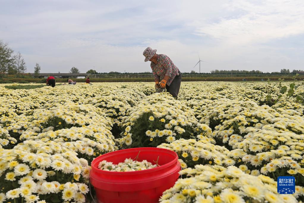 9月29日,在安徽省濉溪縣四鋪鎮(zhèn)菊花種植基地,村民在采收藥用菊花。