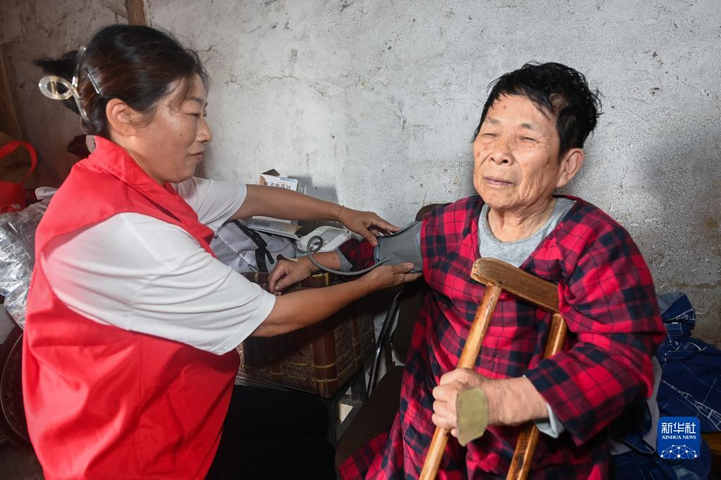 9月30日,“柳溪暖陽”黨員助老志愿服務(wù)隊隊員幫助78歲的老人江寶琴測量血壓。