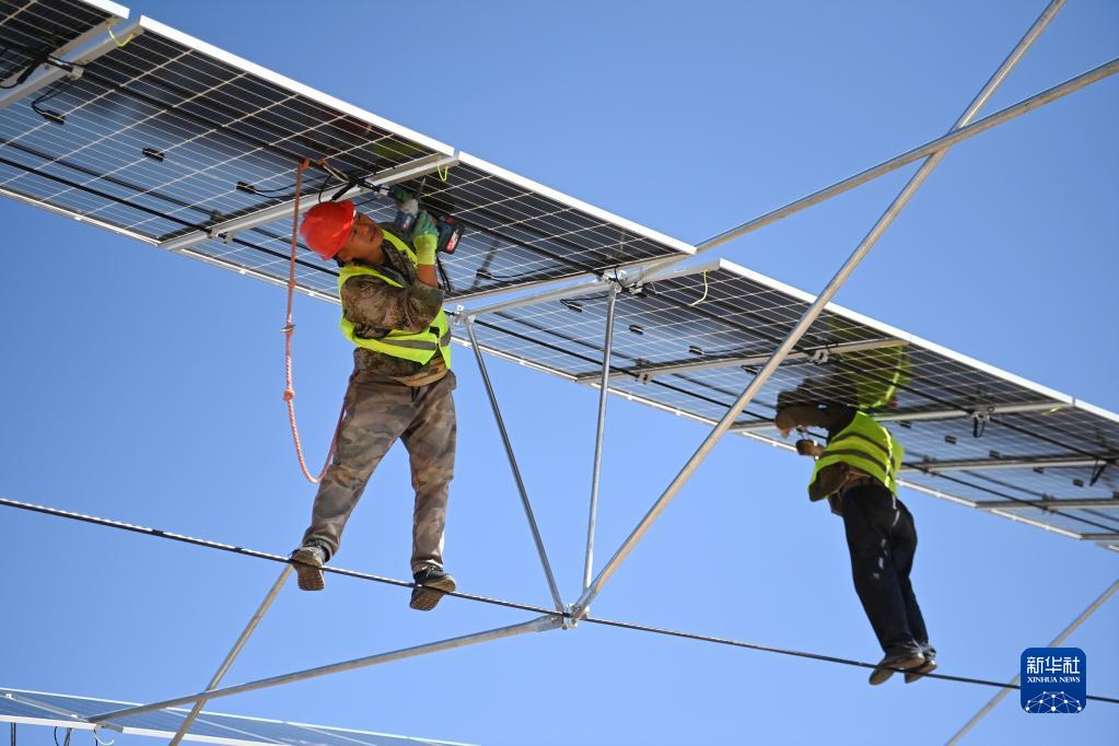 9月29日,在位于甘肅省武威市涼州區的甘肅武威50萬千瓦立體光伏治沙產業化示范項目建設現場,施工人員在安裝光伏板。
