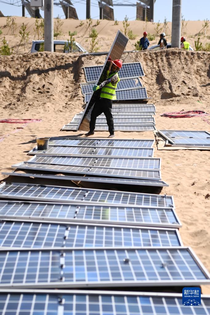 9月29日,在位于甘肅省武威市涼州區的甘肅武威50萬千瓦立體光伏治沙產業化示范項目建設現場,施工人員在搬運光伏板。