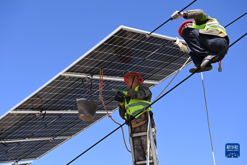 9月29日,在位于甘肅省武威市涼州區的甘肅武威50萬千瓦立體光伏治沙產業化示范項目建設現場,施工人員在安裝光伏板。