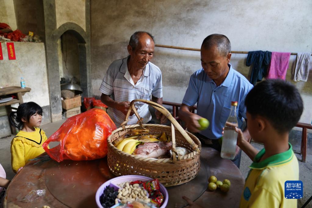 9月15日,謝南京(左二)與弟弟謝稱發(fā)(右二)帶著孩子們一起收拾物品準備前去祭掃。