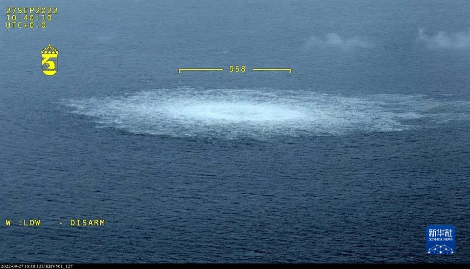 這張瑞典海岸警衛(wèi)隊9月27日發(fā)布的航拍照片顯示的是一處“北溪”天然氣管道泄漏點。