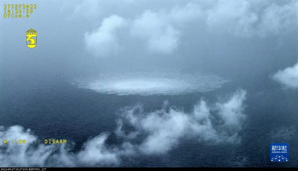 這張瑞典海岸警衛隊9月27日發布的航拍照片顯示的是一處“北溪”天然氣管道泄漏點。