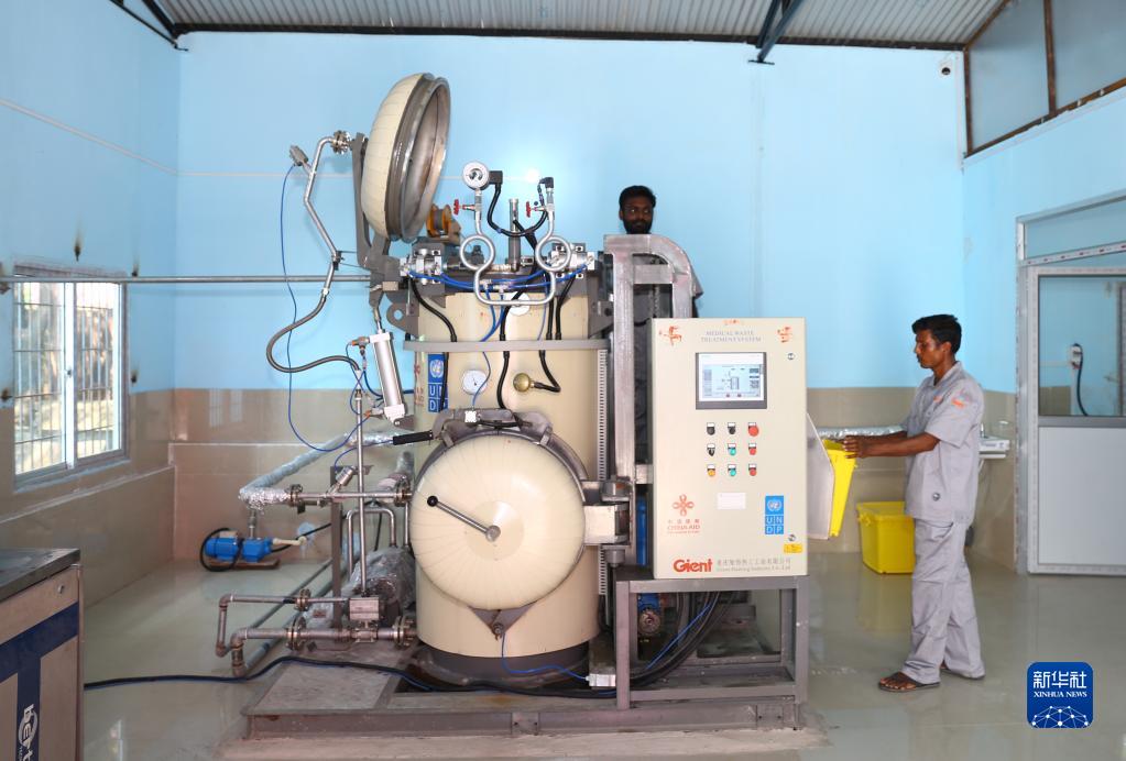 9月29日,在尼泊爾南部比爾甘杰市,納拉亞尼醫(yī)院的工作人員操作中國(guó)援助的醫(yī)療垃圾處理設(shè)備。新華社發(fā)(哈里·馬哈爾詹攝)