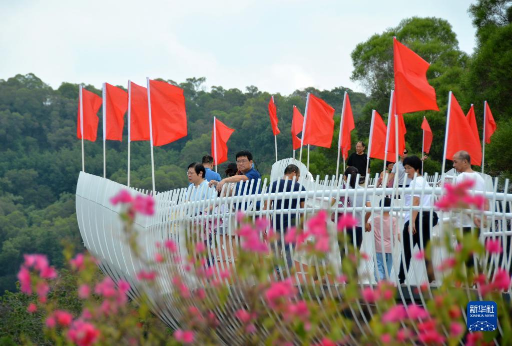 10月1日,在福建省福州市,市民在新開放的金雞山公園茉莉花生態(tài)廊道游玩。
