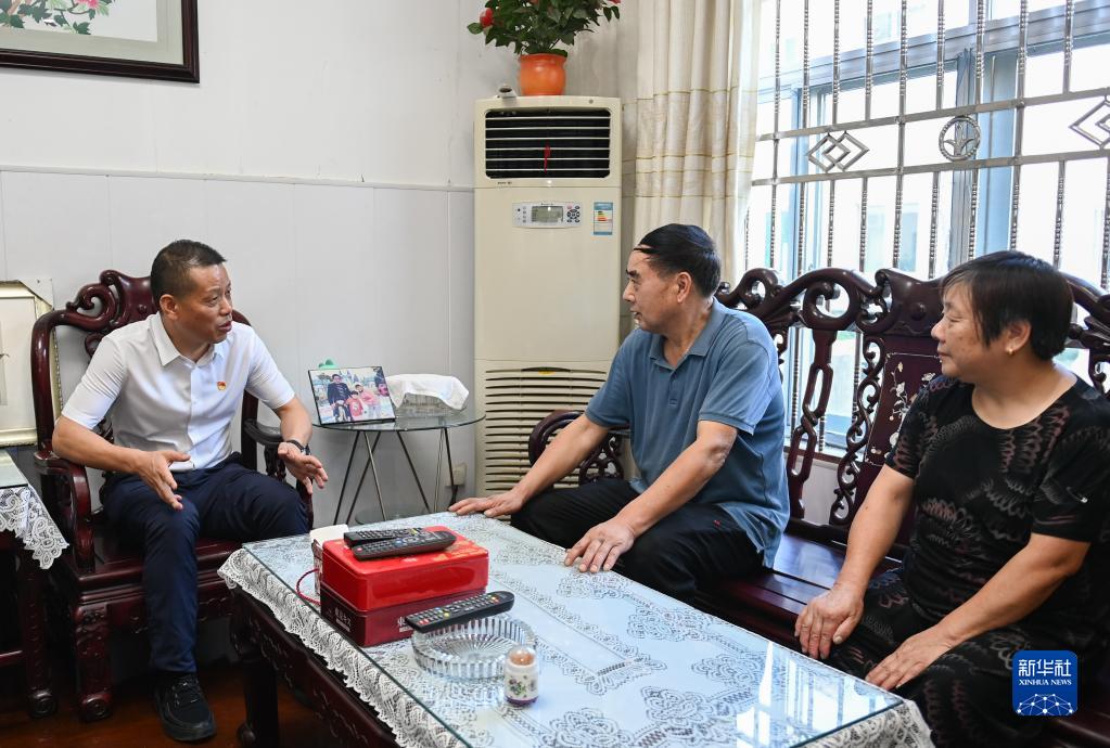 在浙江省寧波市奉化區蕭王廟街道滕頭村,傅平均(左)入戶走訪村民,聽取意見和建議(9月16日攝)。