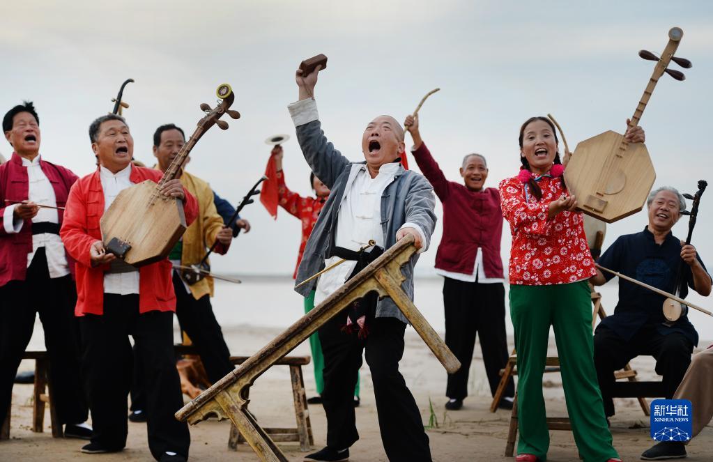 9月26日,在陜西省渭南市潼關縣,西北綜勘黃河老腔藝術團藝人在黃河岸邊表演黃河老腔。