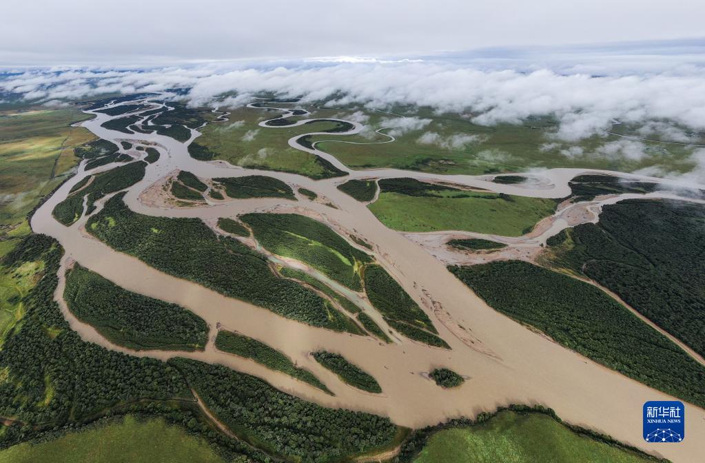 俯瞰位于四川省若爾蓋縣唐克鎮的白河牧場的黃河出川口(2022年8月16日攝,無人機照片)。