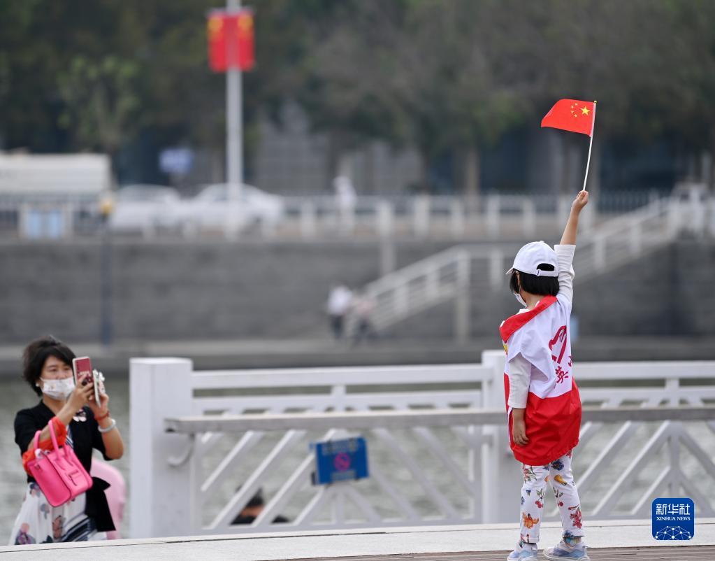 10月1日,在天津市南開(kāi)區(qū)海河岸邊的親水平臺(tái),市民用手機(jī)給孩子拍照。