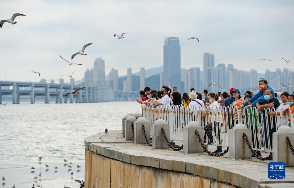 10月1日,在遼寧省大連市,市民在星海廣場游玩。