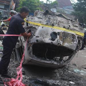 10月2日,在印度尼西亞東爪哇省瑪瑯市,警方人員在事發球場外為被焚毀的車輛系上繩子。