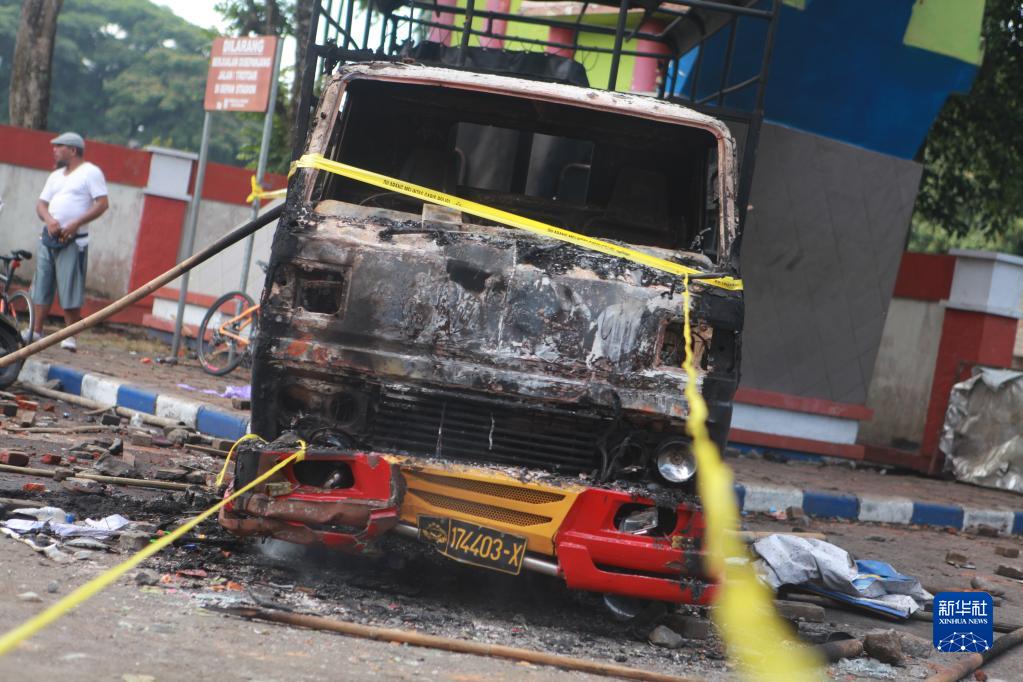 這是10月2日在印度尼西亞東爪哇省瑪瑯市事發球場外拍攝的被焚毀的車輛。新華社發(巴尤·諾凡塔攝)