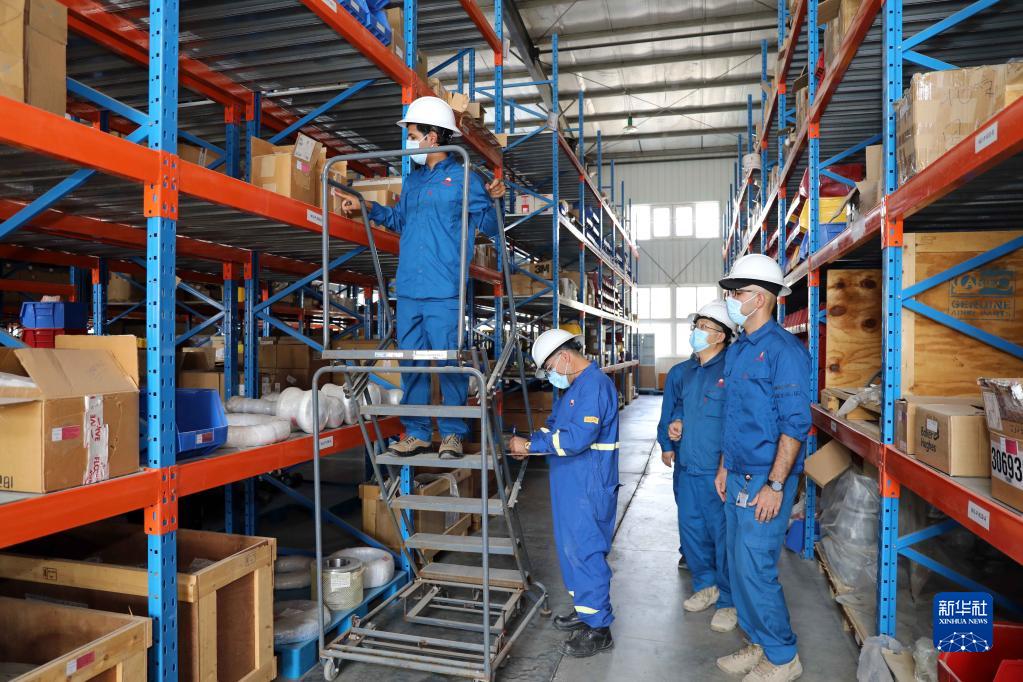 9月24日,在伊拉克米桑省,中伊雙方工作人員在哈法亞油田一處庫房里清點設備。新華社發(哈利勒·達伍德攝)