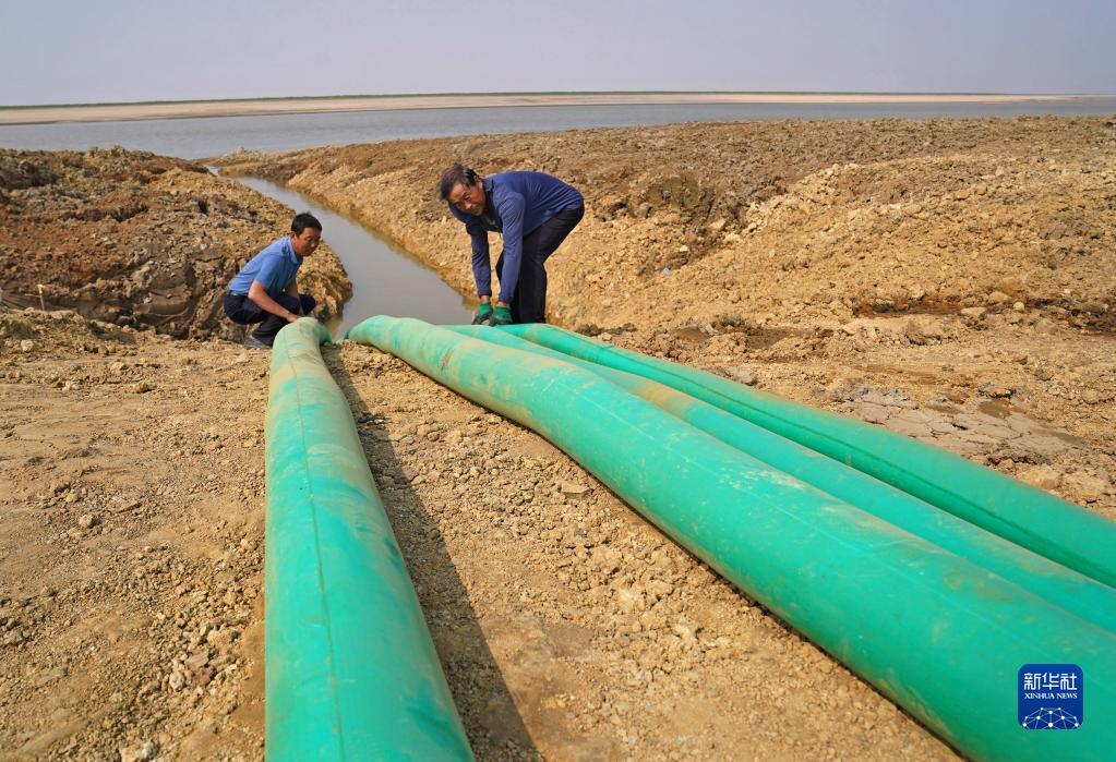 在江西省都昌縣,都昌縣候鳥自然保護區的工作人員用水泵將鄱陽湖主航道的水抽至人工水渠,然后輸入至碟形湖中(9月28日攝)。