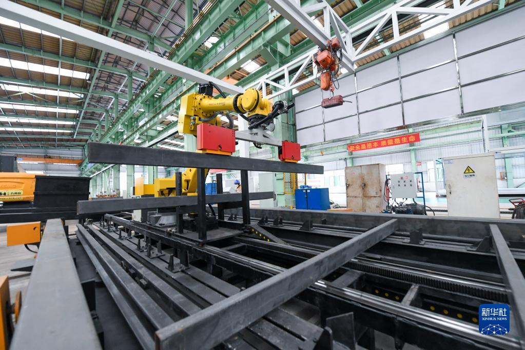 在智能化鋼結(jié)構(gòu)模塊化生產(chǎn)線上,機(jī)械臂在裝配鋼結(jié)構(gòu)模塊(2022年9月28日攝)。