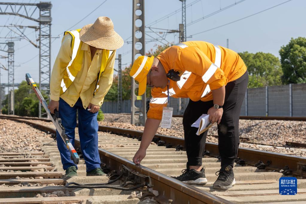 10月2日,在上海市松江區新橋鎮申北四路下穿立交施工現場,中國鐵路上海局集團有限公司上海工務段施工監督員陳得志(右)測量鋼軌軌縫。