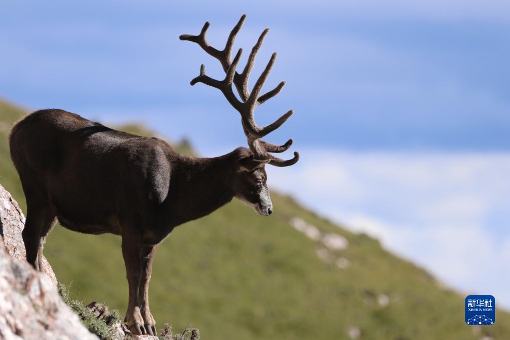 這是在青海省玉樹藏族自治州雜多縣境內的昂賽大峽谷拍攝的白唇鹿(8月5日攝)