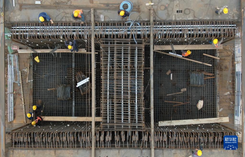 10月2日,中鐵上海工程局施工人員在位于陜西省西安市的西十高鐵跨浐河連續梁0號塊作業(無人機照片)。