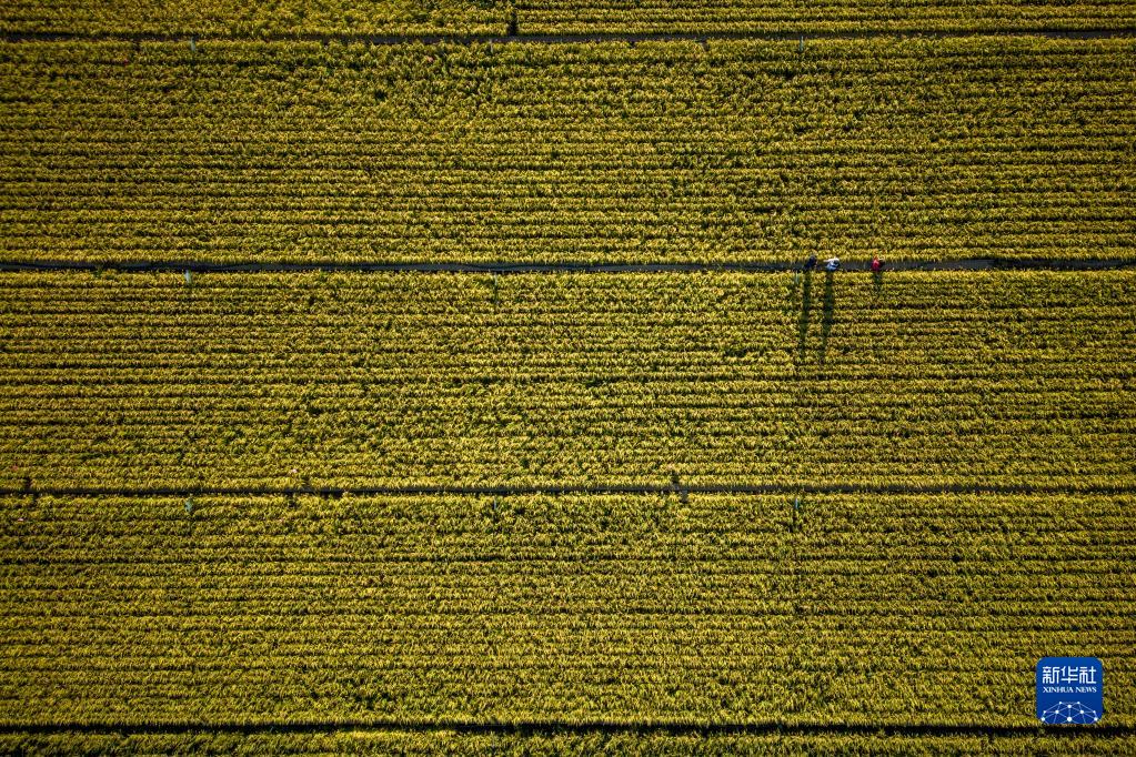 游客在黑龍江省富錦市萬畝水稻科技示范園里游覽(2022年9月2日攝,無人機照片)。