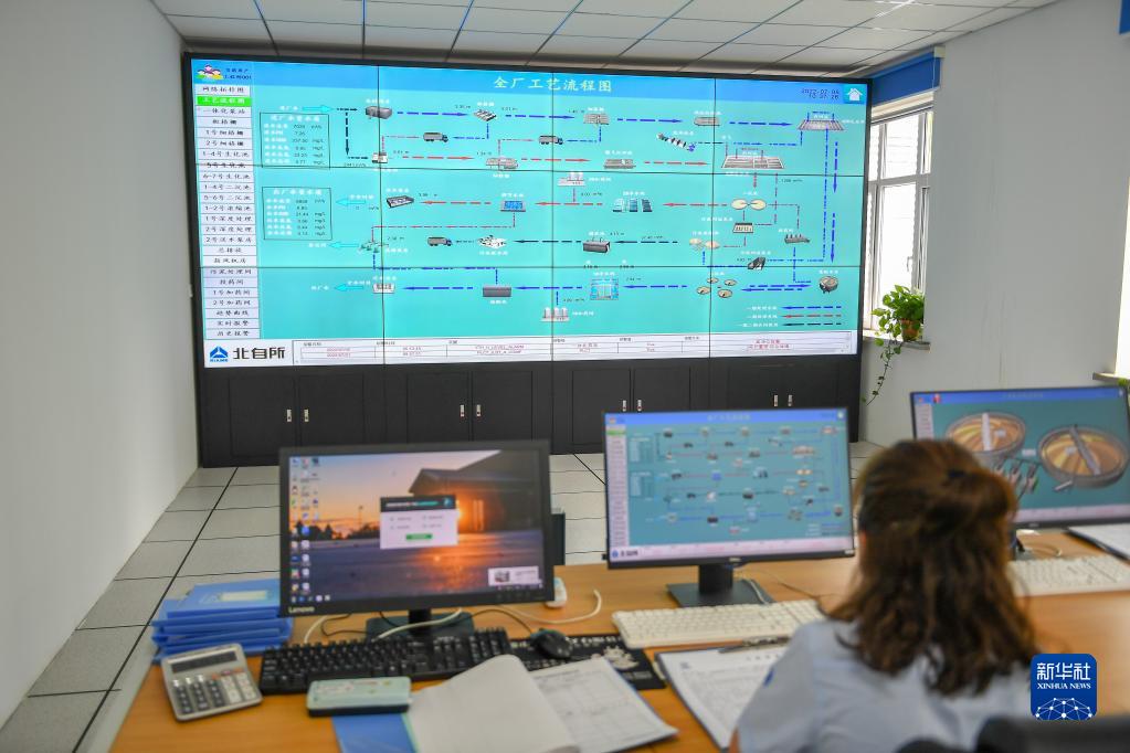 在吉林省遼源市中核遼源環(huán)??萍加邢薰?,工作人員監(jiān)控污水處理設備狀態(tài)(2022年7月5日攝)。