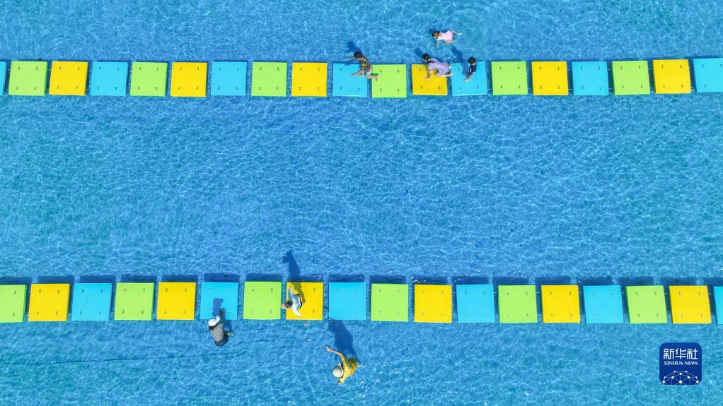 10月2日,游客在浙江省湖州市德清縣乾元鎮城北村礦坑泳池嬉戲(無人機照片)。