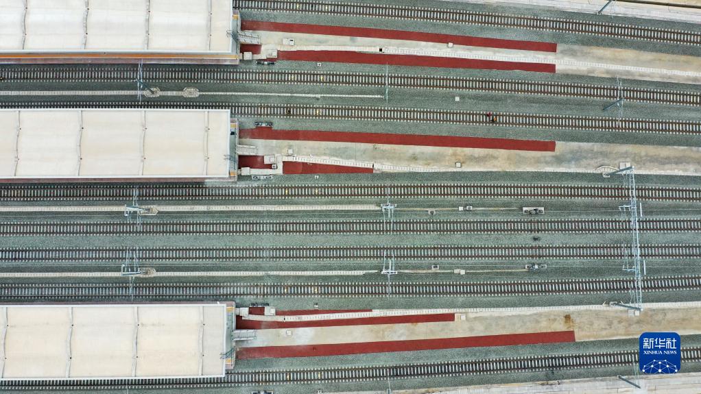 這是完成接觸網送電的銀蘭高鐵甘肅段秦王川站(10月2日攝,無人機照片)。