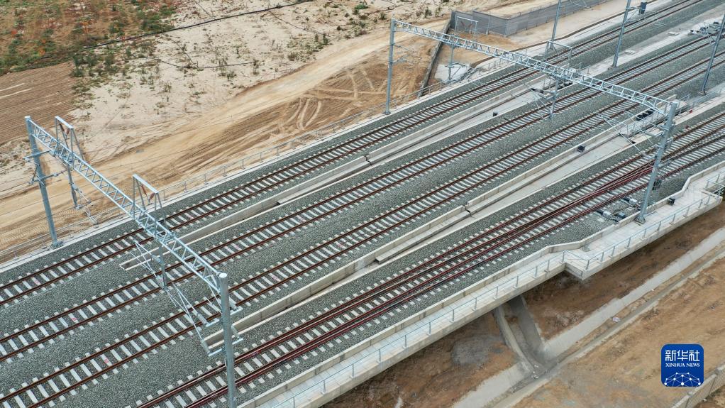 這是完成接觸網送電的銀蘭高鐵甘肅段線路(10月2日攝,無人機照片)。
