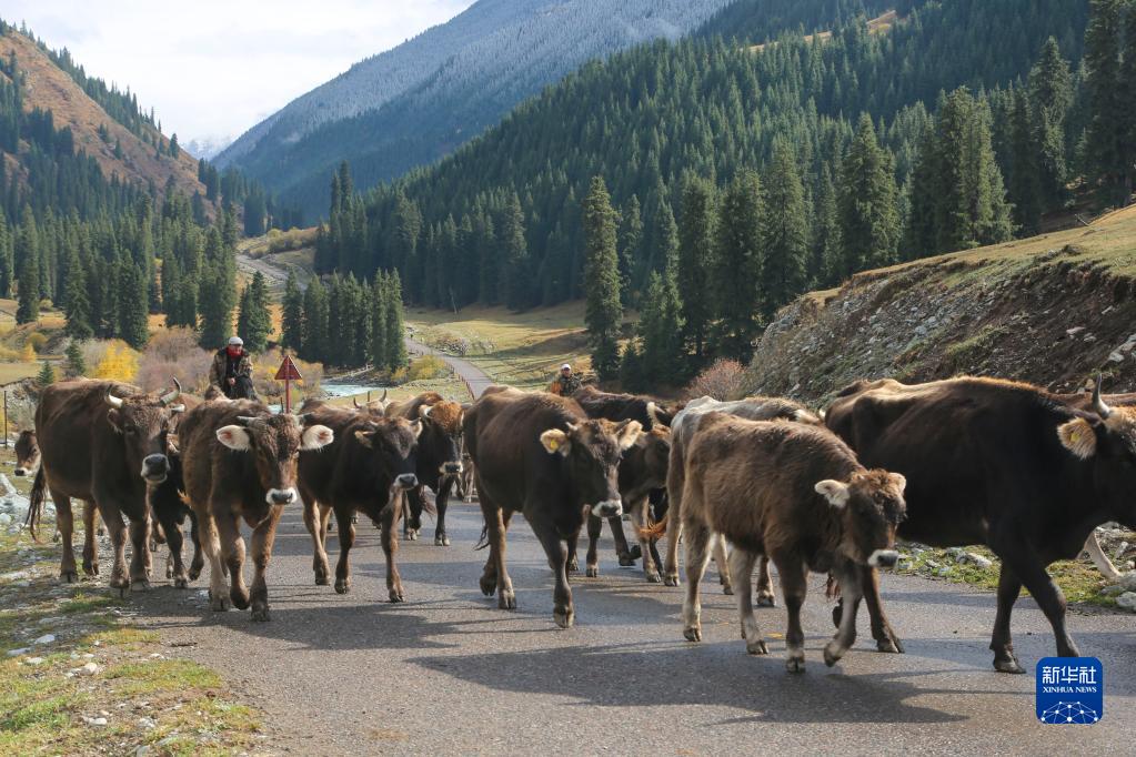 新疆昭蘇:褐牛轉場出天山