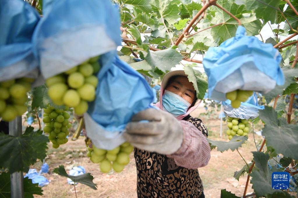 寧夏銀川市永寧縣望洪鎮(zhèn)高渠村村民在大棚采摘“陽(yáng)光玫瑰”葡萄(10月2日攝)。