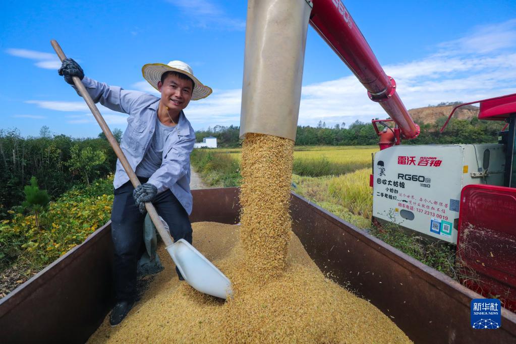 10月2日,河南省信陽市光山縣南向店鄉何畈村鑫磊合作社社員在搶收水稻。