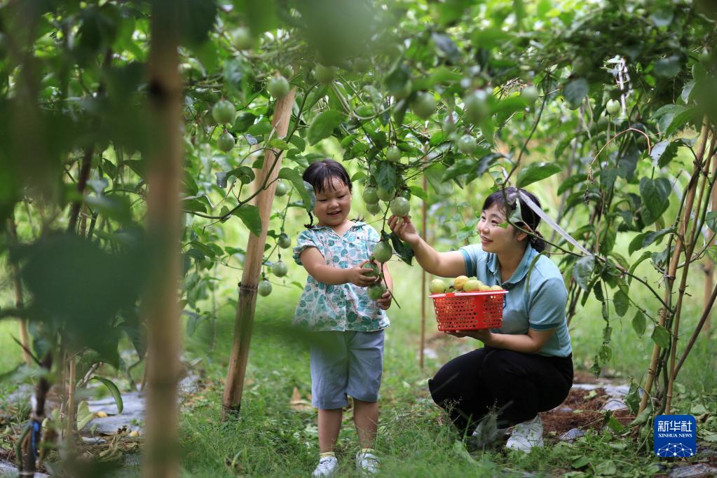 10月2日,游客帶著孩子在貴州省榕江縣平江鎮(zhèn)巴魯村百香果園采摘百香果。